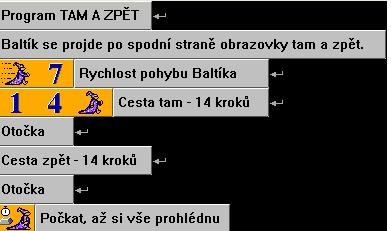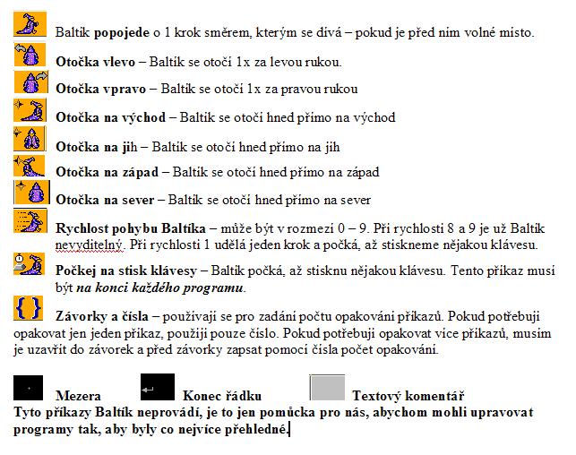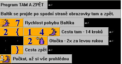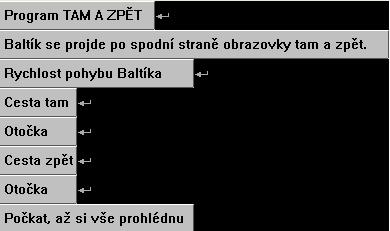 Potom postupně doplňujte do programu PŘÍKAZY. každou část programu nezapomeňte hned vyzkoušet, zda-li Baltík plní vaše příkazy podle očekávání a není někde v programu chyba. Chyba se lehce udělá, ale hůře opravuje. Nesnažte se proto sepsat celý program najednou, tvořte jej po částech.